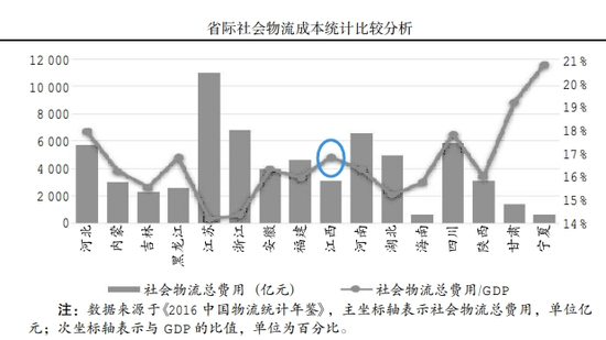 根据《2016年中国物流统计年鉴》,彼时江西的物流总费用占GDP的比重大概为16.4%,远高于江苏和浙江的14.2%。