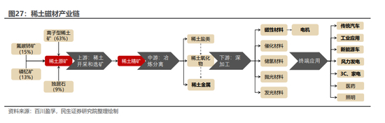 在稀土永磁材料生产链条中,中重稀土至关重要。根据稀土磁材产业链,稀土永磁材料的原材料来自于稀土金属,而它正是由稀土原矿分离制成的,其中中重稀土占据的比例高达72%(离子型稀土63%,独居石9%),轻稀土只占据28%。