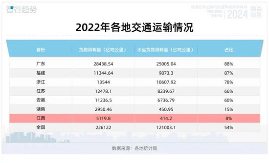 2022年,江西的总货物周转量是5119.8亿吨每公里,而水运货物周转量却仅仅只有414.2亿吨每公里,占比8%,远低于全国54%的水平。相比之下,环江西的省份中,广东水运占比最高,达到88%,福建为87%、浙江为78%、江苏66%、安徽60%,均高于全国水平。就连货物周转量比江西少的湖南,其水运占比都比江西高7%。