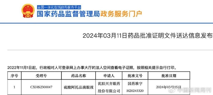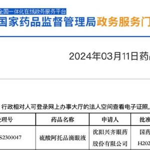 3月11日,国家药品监督管理局官网发布消息,沈阳兴齐眼药股份有限公司生产的0.01%硫酸阿托品滴眼液获批上市。来源:国家药监局官网