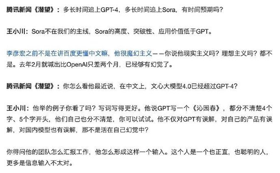 就像王小川虽然吐槽李彦宏,但也认为“这个人是一个也正直、也聪明的人”,更多是信息输入不太对。