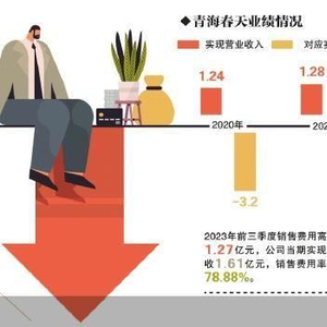 2023年,青海春天的销售费用仍在继续走高,根据公司披露的当年三季报,公司2023年前三季度销售费用高达1.27亿元,公司当期实现营收1.61亿元,经计算,销售费用率达78.88%。