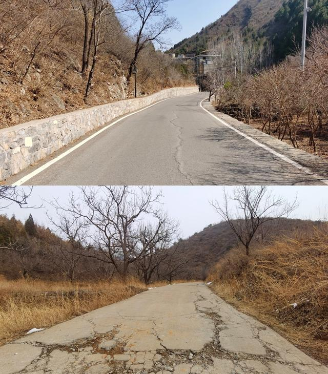 山坡下,则是另一番景象:即使没有界碑标注,省界仍清晰可见——北京一侧的双车道柏油路平整宽阔,一过交界的道路马上变为石板路。