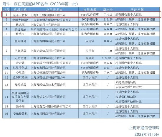 2023年7月,上海市通信管理局官方微信号发布《关于侵害用户权益行为APP的通报(2023年第一批)》。通报指出,该局近期组织第三方检测机构对本市移动互联网应用程序侵害用户权益行为开展检查。经检测发现122款APP存在“违规收集个人信息”“超范围收集个人信息”“过度索取权限”等相关问题。该局已通报相关运营企业,督促存在问题的APP进行整改。截至目前,尚有16款APP未完成整改,上海汇正财经顾问有限公司旗下app“金斗云智投”在列。