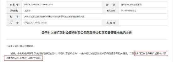 随着规模的扩张,上海汇正的问题也不断显现。据中国证监会官网信息,2019年12月,该公司被上海证监局采取责令改正的监督管理措施。经查,上海汇正在开展证券投资顾问业务过程中,存在以下违规行为:一是未有效核实部分客户的身份信息和相关情况;二是部分员工在业务推广过程中对服务能力和过往业绩进行误导性宣传。