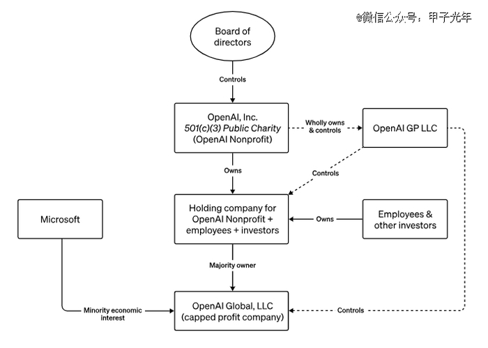 首先,非营利组织OpenAI Nonprofit全资拥有并控制一个管理实体OpenAI GP LLC,该实体控制和管理营利性子公司。