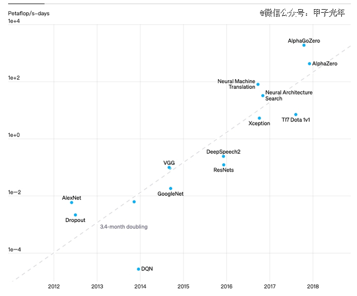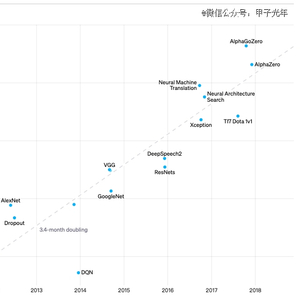 但是随着研究的推进,OpenAI发现人工智能系统除了需要算法创新,还需要使用最多的计算能力。根据OpenAI的估算,从2012年的AlexNet到2018年的AlphaGo Zero,计算量增加了30万倍。