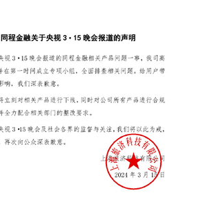 针对央视3·15晚会报道的同程金融相关产品问题一事,同程金融还第一时间成立专项小组,全面排查相关问题,同时对用户带来的不良影响深表歉意。