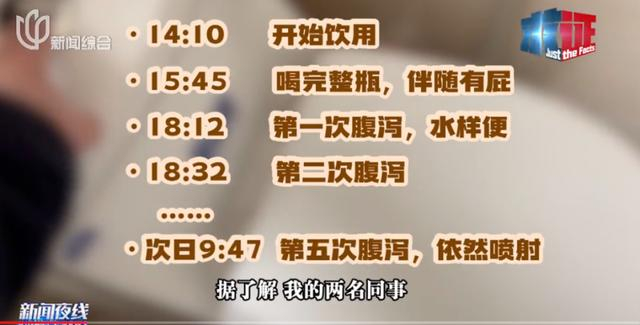 记者下午2点多喝下酸奶后,4小时开始出现腹泻症状,断断续续跑了四五次厕所,直到第二天接近10点时仍在腹泻。“据了解,我的两名同事也出现了不同程度的腹泻。”