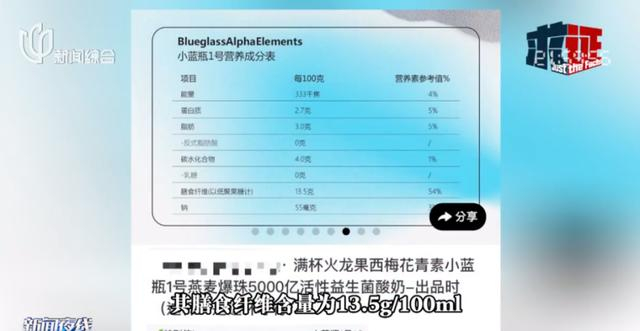 此外,小蓝瓶的营养成分表显示,其膳食纤维含量为13.5g/100ml,按3瓶计算,这杯酸奶至少含有40.5g的膳食纤维。这是不是产生腹泻的直接原因呢?