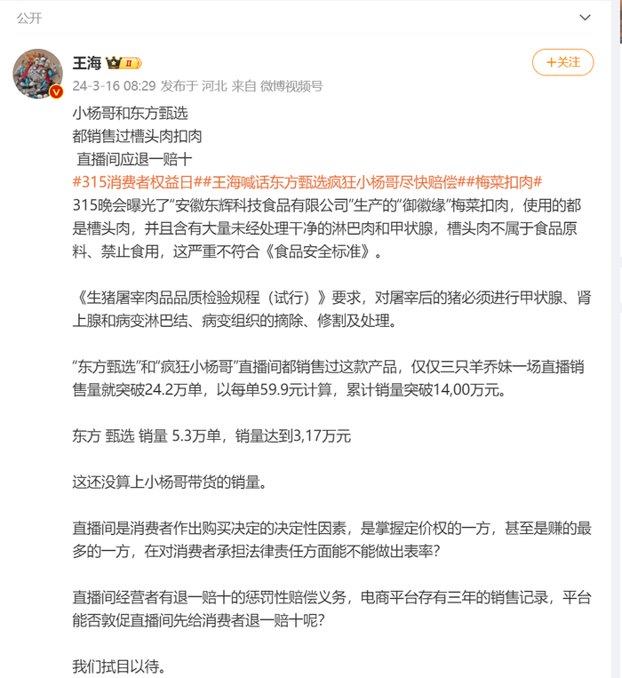 此前,知名打假人王海3月16日在微博发文称,3·15晚会曝光了“安徽东辉科技食品有限公司”生产的“御徽缘”梅菜扣肉,使用的都是槽头肉,并且含有大量未经处理干净的淋巴肉和甲状腺,槽头肉不属于食品原料、禁止食用,这严重不符合《食品安全标准》。