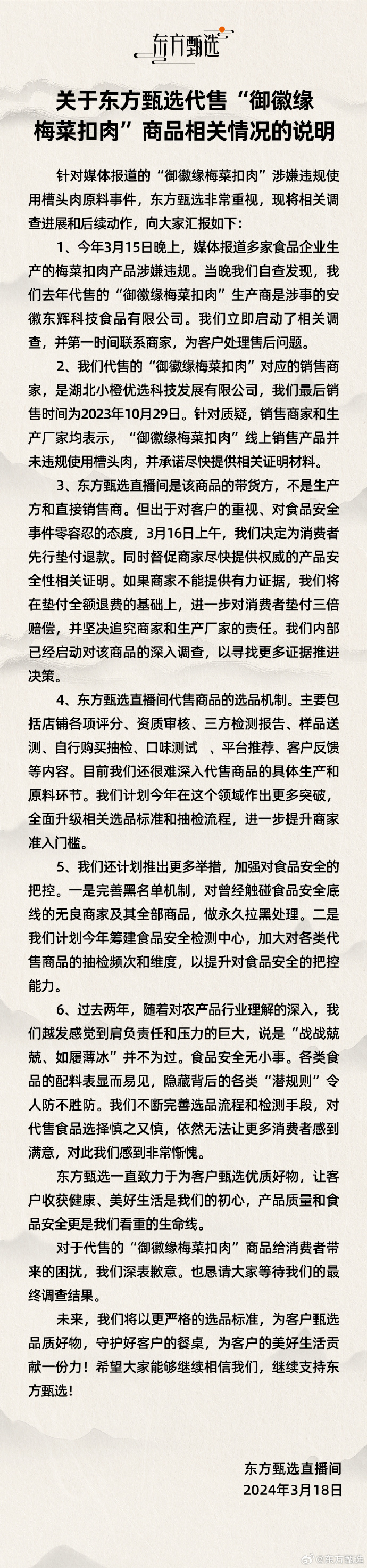 东方甄选称,今年3月15日晚上,媒体报道多家食品企业生产的梅菜扣肉产品涉嫌违规。东方甄选当晚自查发现,去年代售的“御徽缘梅菜扣肉”生产商是涉事的安徽东辉科技食品有限公司;代售的“御徽缘梅菜扣肉”对应的销售商家,是湖北小橙优选科技发展有限公司,东方甄选的最后销售时间为2023年10月29日。针对质疑,销售商家和生产厂家均表示,“御徽缘梅菜扣肉”线上销售产品并未违规使用槽头肉,并承诺尽快提供相关证明材料。