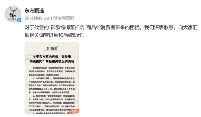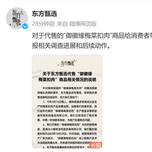 东方甄选为代售“御徽缘梅菜扣肉”致歉:感到非常惭愧