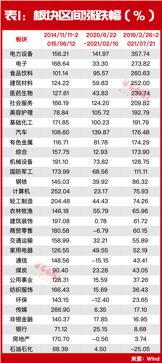 回顾历次市场“走牛”过程中的行业以及个股表现来看,“牛股”的风格在不同时期均多存在一些差异性,而且主题标签各有不同。2014年11月11日~2015年6月12日,在上证指数累计上涨超过1倍期间,传媒、计算机、轻工制造、建筑装饰、机械设备等涨幅居前,该阶段的市场主线主要为TMT、机械制造等;再如创业板指数于2019年2月26日~2021年7月21日上涨超过130%期间,电力设备、电子、食品饮料、建筑材料、医药生物等涨幅居前。该阶段的市场主线主要为新能源、食品饮料、医药、科技等赛道股(见表1)。