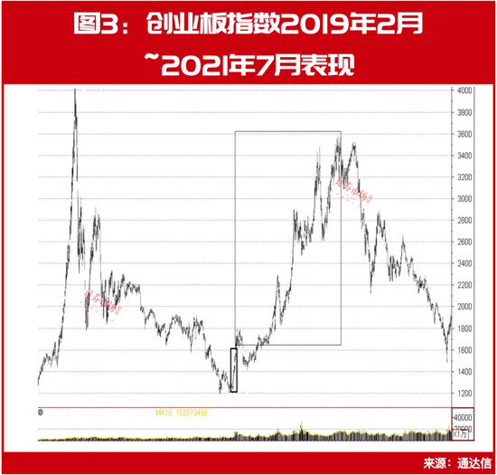 创业板的“技术牛”信号也曾多次出现。数据显示,2019年2月1日~2019年2月25日,创业板指数累计上涨25%,此后,随即开启了一轮长牛行情。如自2019年2月26日~2021年7月21日,震荡上涨超过两年,期间上涨超过130%(见图3)。