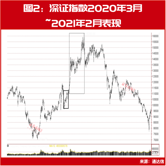再以深证指数为例,2020年3月24日~2020年6月19日期间,在经过此前的震荡下跌后,深证指数累计上涨超过20%。在该“技术牛”信号出现之后,深证指数继续迎来上涨,2020年6月22日~2021年2月10日,累计上涨近40%(见图2)。