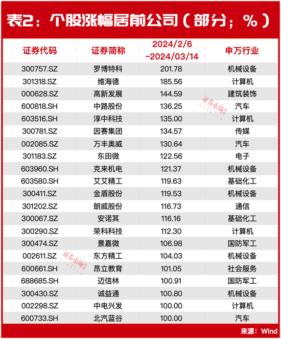 当前,“牛股”的表现也存在一些规律,自市场于2月6日止跌反弹以来,计算机、传媒、电子、机械设备、汽车等涨幅居前。它们多受到AI(人工智能)、算力、机器人、工业母机等相关事件以及利好因素驱动。罗博特科、维海德、高新发展、中路股份、淳中科技、因赛集团、万丰奥威、东田微、克来机电等相关个股涨幅居前(见表2)。
