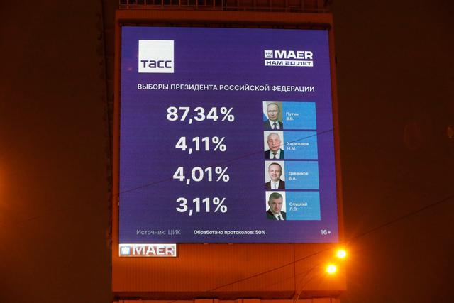 3月17日在俄罗斯首都莫斯科街头拍摄的屏幕上的总统选举实时统计数据。新华社发