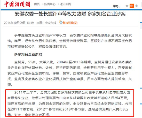老乡鸡虽然在最新招股书中极力规避此事,称发行人控股股东及实际控制人不存在贪污、贿赂、侵占资产等形式犯罪。