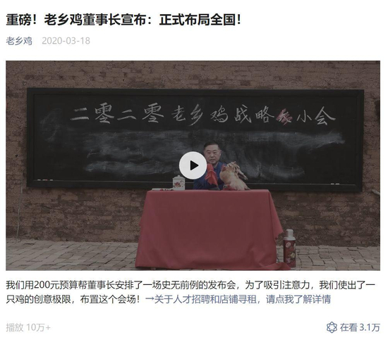 老乡鸡发布了选址在农村,成本仅200元的公司发布会视频,以接地气的朴实风格成为了一众高大上公司发布会中的一股清流,瞬间引爆了互联网。