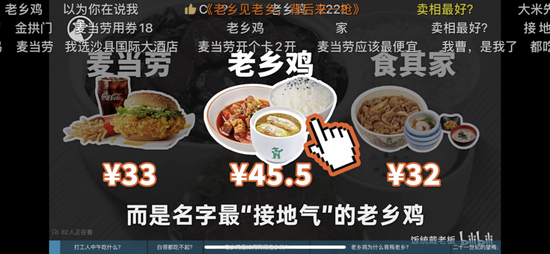 在标题为《有的人月薪两万,只敢在老乡鸡点两个菜》的视频中,内容和观众弹幕都在吐槽,名字最接地气的老乡鸡反而最贵,对此有评论犀利点评“老乡鸡专宰‘老乡’,不宰‘鸡’。”