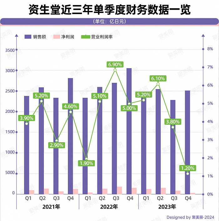 结合近三年财报数据来看,或因受到日本排放“核污水”事件影响,资生堂2023年Q3、Q4创下近两年单季度历史最低销售额,尤其是Q3。