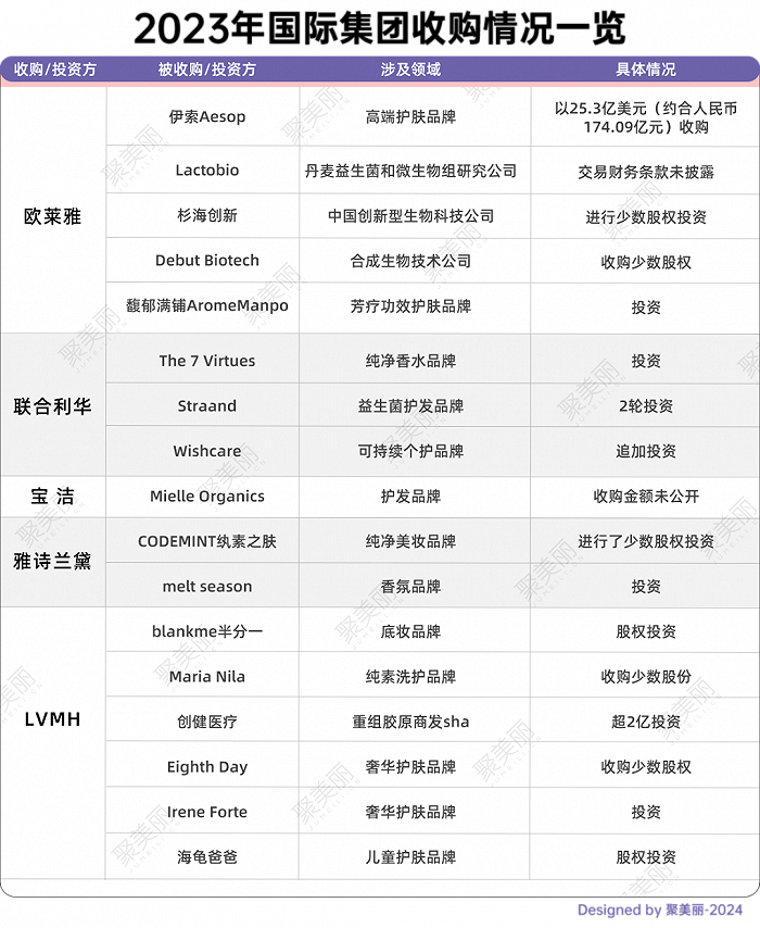 除了优化、出售品牌外,“收购”作为不少国际美妆企业扩张、扩充品牌矩阵的惯用策略,在去年也有体现,以中国市场为例,过去一年,包含欧莱雅、雅诗兰黛等集团在内,对于中国本土品牌的投资事件并不少见。