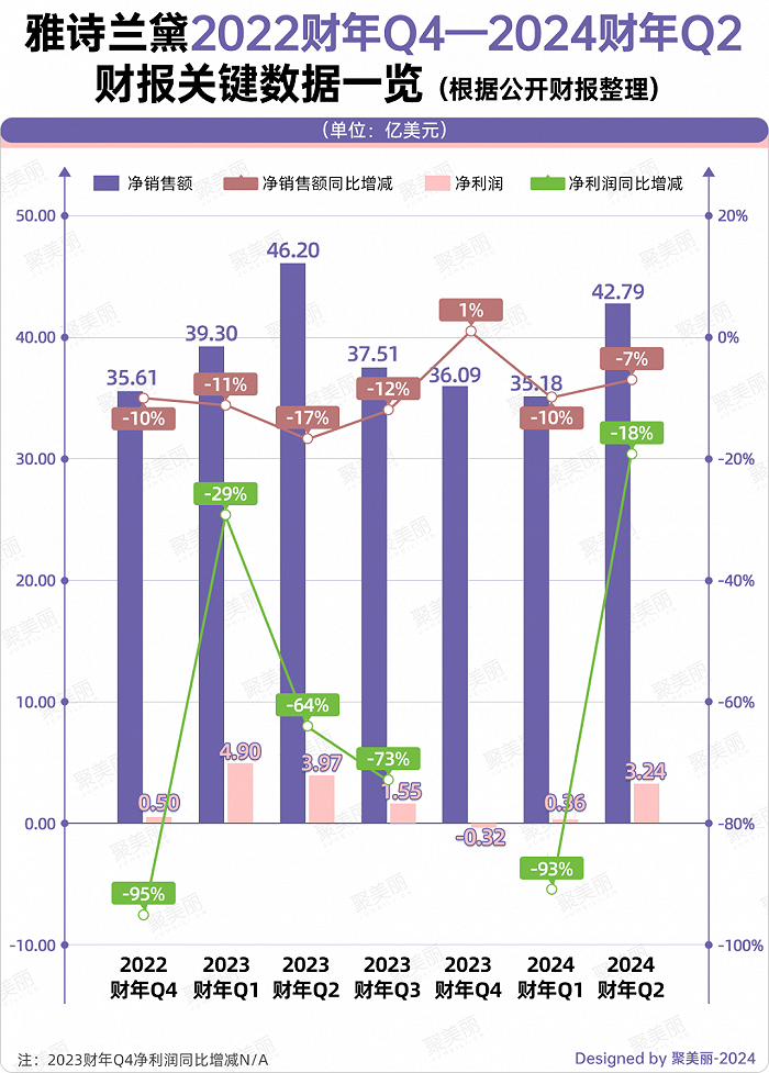 不仅如此,聚美丽从雅诗兰黛近两年披露的财报数据发现,其多几个季度的销售额净利润大致均呈现双降状态。