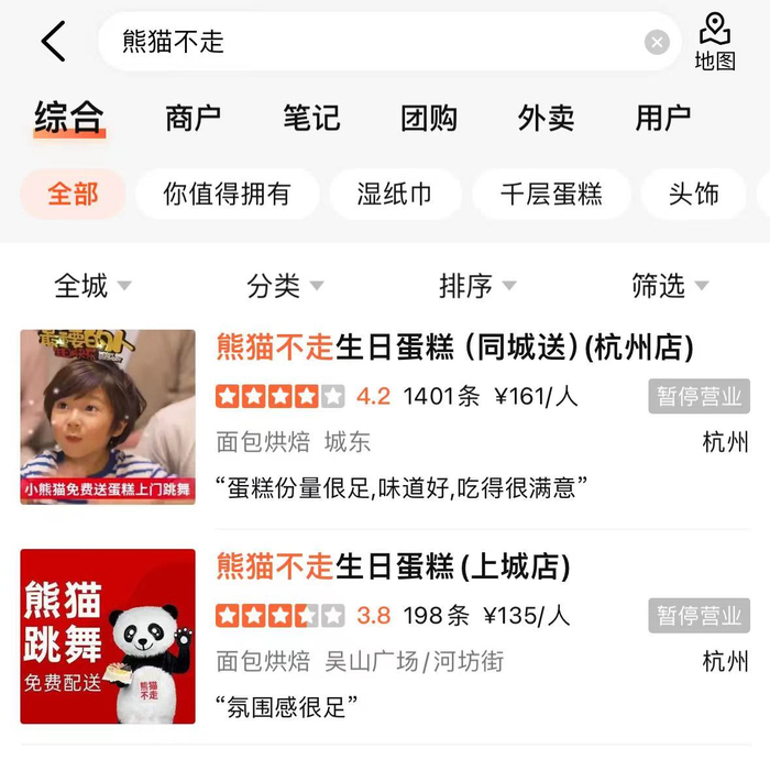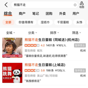 在大众点评看见,北京、广州、深圳、杭州的熊猫不走蛋糕门店均已暂停营业,且熊猫不走蛋糕的微信小程序因为违反《微信小程序运营规范》,暂时无法访问。
