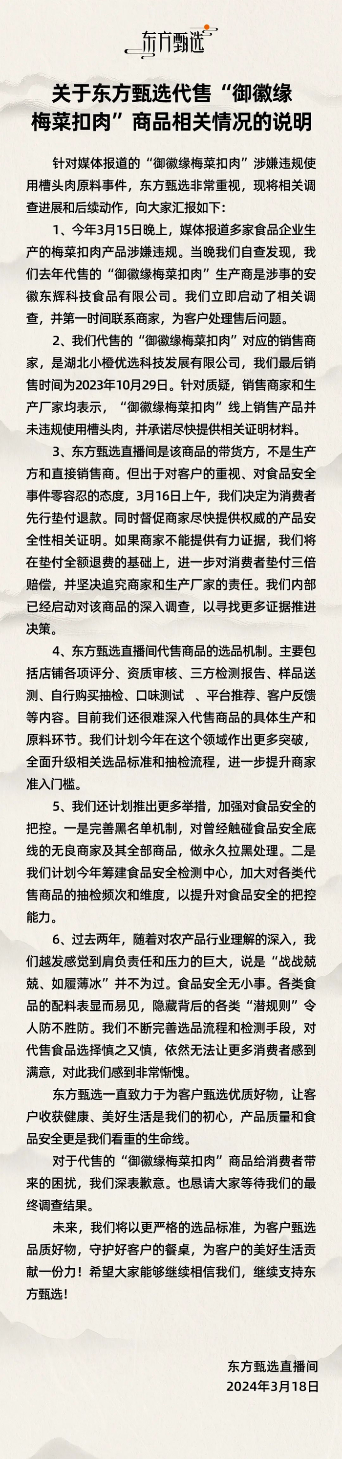东方甄选3月18日通过官方微博发布情况说明称,对于代售的“御徽缘梅菜扣肉”商品给消费者带来的困扰,深表歉意。