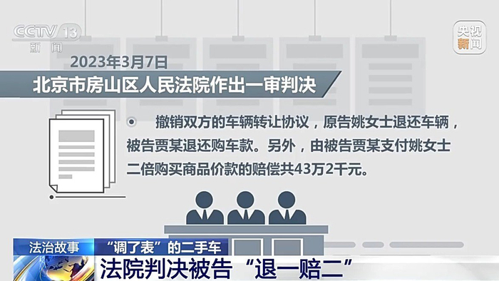 去年3月7日,北京市房山区人民法院作出一审判决,撤销双方的车辆转让协议,原告姚女士退还车辆,被告贾某退还购车款。另外,由被告贾某支付姚女士二倍购买商品价款的赔偿共432000元。