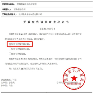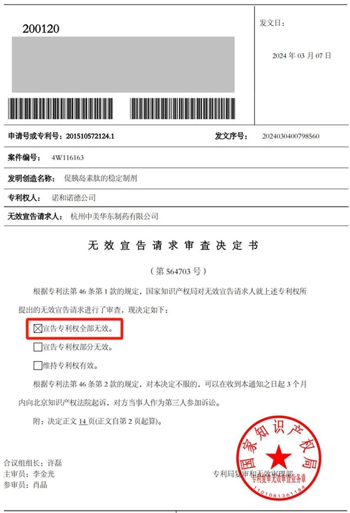 本次无效宣告的请求人杭州中美华东正是华东医药子公司,无效涉及的专利为利拉鲁肽的制备方法专利,最终以不具备创造性为由被宣告专利权全部无效;其同族专利ZL2016101907759在2022年9月也同样以不具备创造性为由被宣告专利权全部无效。