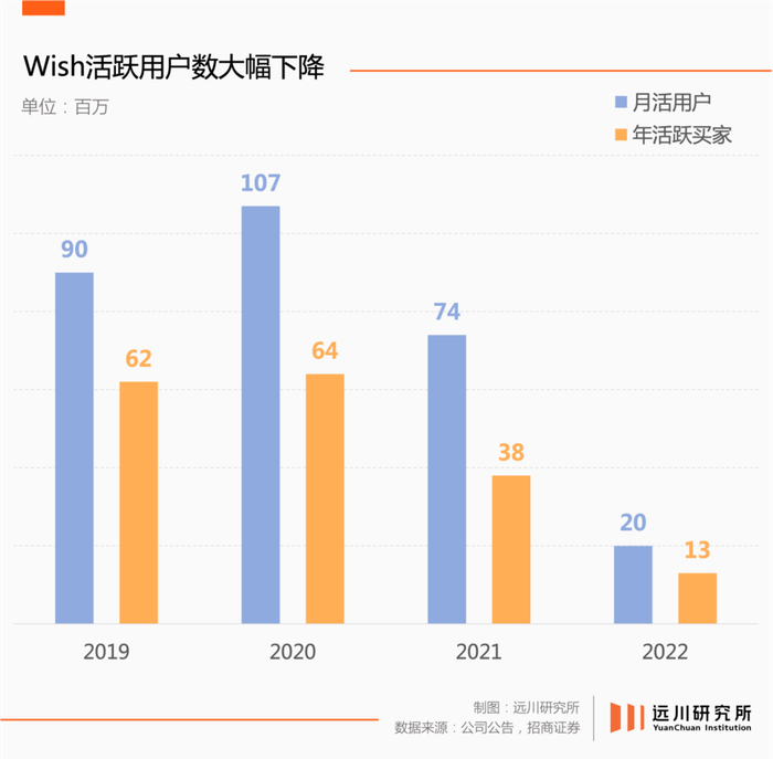 Wish自己吞下了最后的苦果。到2022年末,Wish先是把月活跌到了仅剩2000万,随后是营销开支跌了80%,最终连带整体营收暴跌73%,全年亏损3.84亿美元。