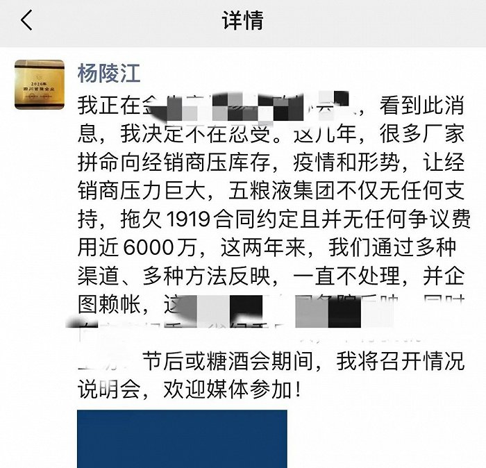 酒类网络零售平台1919董事长、同时也是作为五粮液重要经销商的杨陵江亲自下场,在朋友圈怒斥,称最近几年很多厂家拼命向经销商压库存,让经销商压力巨大。他还提到,“五粮液集团不仅无任何支持,拖欠1919合同约定且并无任何争议费用近6000万”。