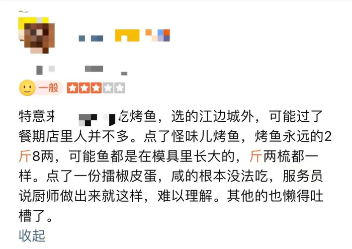 在大众点评上,也有消费者质疑称,“吃过几次(江边城外),每次都按3.2斤收费,你确定每条鱼都是3.2斤吗?”