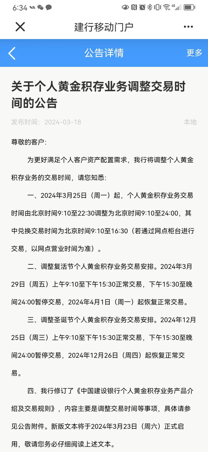 在“建行移动门户”的公告中,建设银行表示,为更好满足个人客户资产配置需求,我行将调整个人黄金积存业务交易时间。除了自3月25日起延长交易时间外,建行还表示,调整复活节个人黄金积存业务交易安排。2024年3月29日上午9点10分到下午15点30分政策交易,下午3点半到晚间24点暂停交易。4月1日起恢复正常交易。调整圣诞节个人黄金积存业务交易安排。2024年12月25日上午9点10分到下午15点30分政策交易,下午3点半到晚间24点暂停交易。