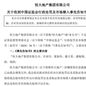 3月18日,恒大地产集团有限公司(以下简称恒大地产)发布公告称,恒大地产及相关责任人于近日收到中国证券监督管理委员会(以下简称证监会)行政处罚及市场禁入事先告知书(处罚字〔2024〕36号)(以下简称《事先告知书》)。