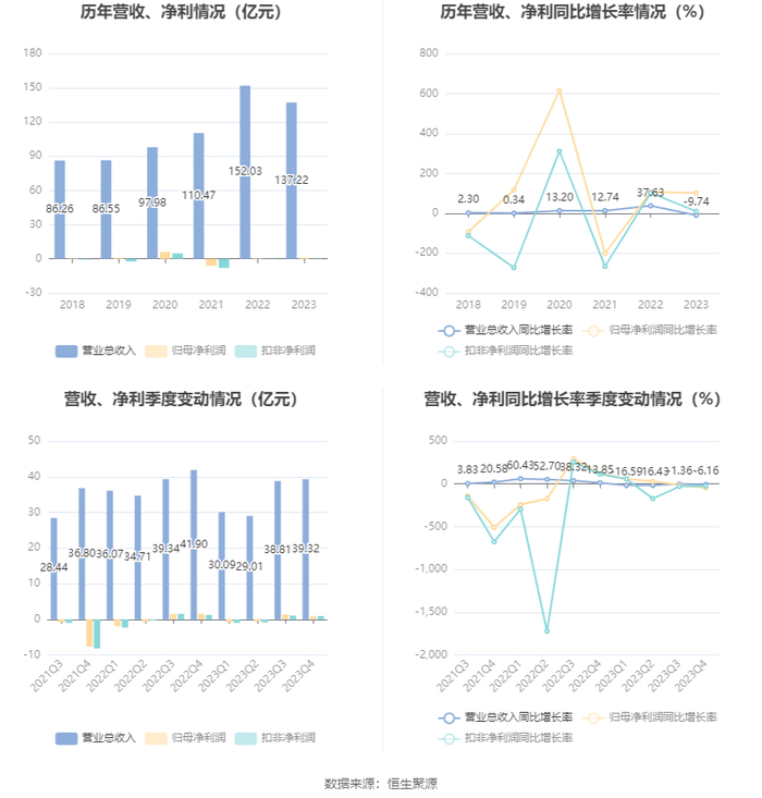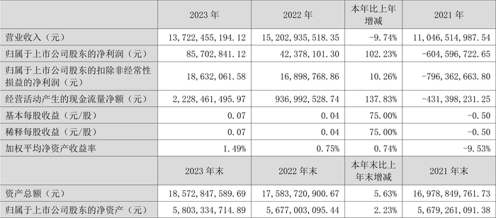 2023年,公司经营活动现金流净额为22.28亿元,同比增长137.83%;筹资活动现金流净额-3.40亿元,同比减少10.97亿元;投资活动现金流净额-13.71亿元,上年同期为-16.12亿元。