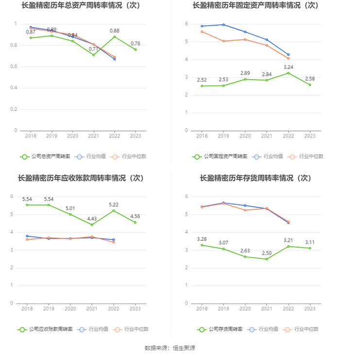 营运能力方面,2023年,公司公司总资产周转率为0.76次,上年同期为0.88次(2022年行业平均值为0.67次,公司位居同行业27/94);固定资产周转率为2.58次,上年同期为3.24次(2022年行业平均值为4.28次,公司位居同行业58/94);公司应收账款周转率、存货周转率分别为4.56次、3.11次。