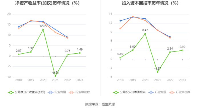 数据显示,2023年公司加权平均净资产收益率为1.49%,较上年同期增长0.74个百分点;公司2023年投入资本回报率为2.90%,较上年同期增长0.56个百分点。