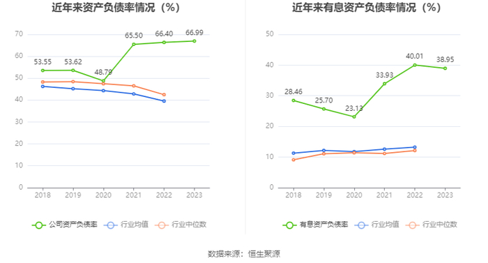 在偿债能力方面,公司2023年年末资产负债率为66.99%,相比上年末上升0.61个百分点;有息资产负债率为38.95%,相比上年末下降1.06个百分点。