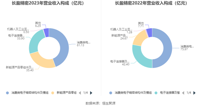 分产品来看,2023年公司主营业务中,消费类电子精密结构件及模组收入61.13亿元,同比下降19.53%,占营业收入的44.55%;新能源产品零组件及连接器收入35.40亿元,同比增长43.46%,占营业收入的25.80%;电子连接器及智能电子产品精密小件收入33.90亿元,同比下降20.06%,占营业收入的24.70%。