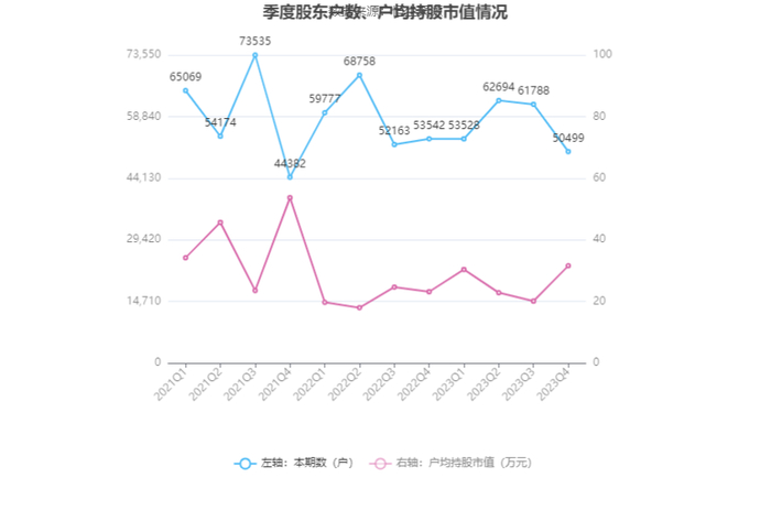 筹码集中度方面,截至2023年年末,公司股东总户数为5.05万户,较三季度末下降了1.13万户,降幅18.27%;户均持股市值由三季度末的20.14万元上升至31.59万元,增幅为56.85%。