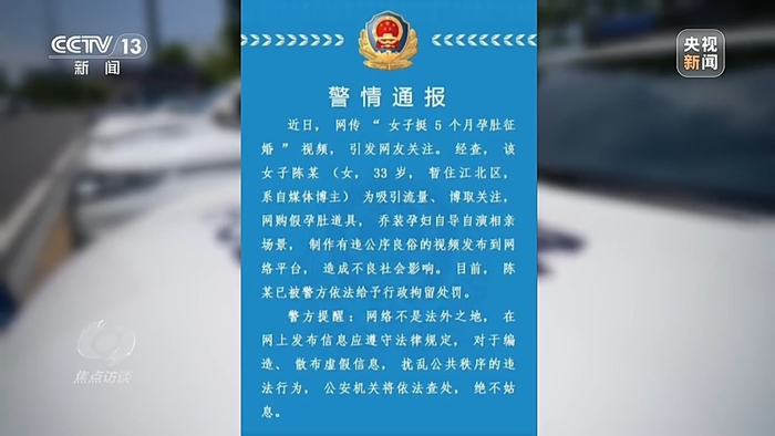 根据警方的通报信息显示,该女子姓陈,是一名自媒体博主,为了吸引流量乔装孕妇自导自演了相亲场景。