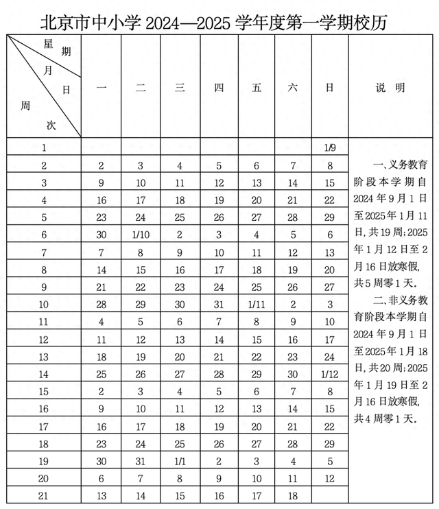 2025年北京中小学寒假时间为2025年1月12日(星期日)至2月16日(星期日),共5周零1天。