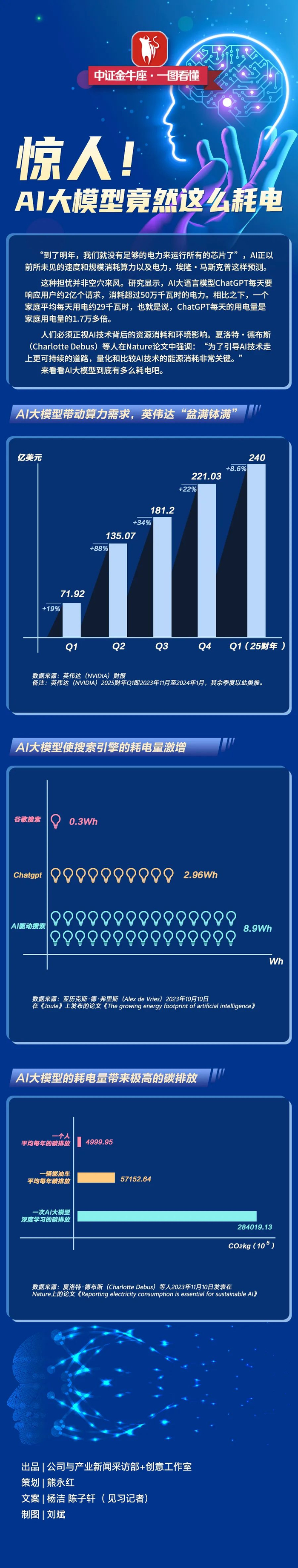 研究人员亚历克斯·德·弗里斯2023年10月10日在《Joule》上发布的论文显示,在AI技术加持下,传统互联网运行的耗电量会成倍数增长。论文数据显示,一次标准谷歌搜索耗电0.3瓦时,AI大语言模型ChatGPT响应一次用户请求耗电约2.96瓦时,在AI大模型驱动下的一次谷歌搜索则耗电8.9瓦时。