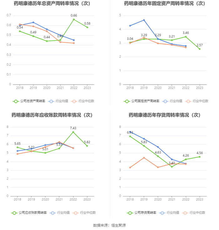 营运能力方面,2023年,公司公司总资产周转率为0.58次,上年同期为0.66次(2022年行业平均值为0.45次,公司位居同行业7/28);固定资产周转率为2.57次,上年同期为3.46次(2022年行业平均值为2.79次,公司位居同行业11/28);公司应收账款周转率、存货周转率分别为5.82次、4.56次。