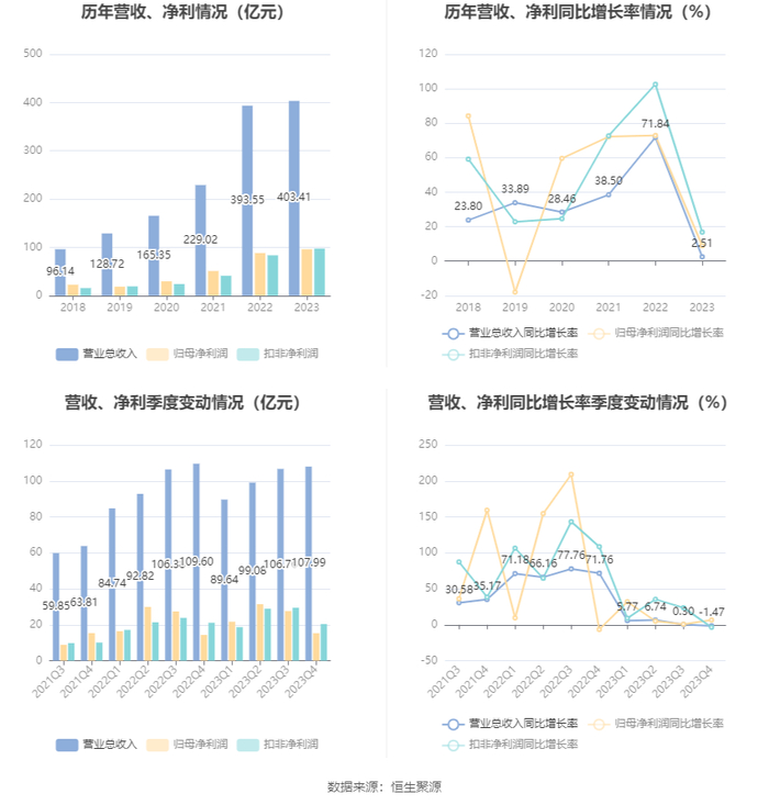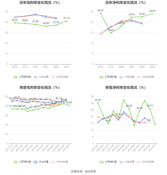 2023年,公司毛利率为41.18%,同比上升3.88个百分点;净利率为24.05%,较上年同期上升1.43个百分点。从单季度指标来看,2023年第四季度公司毛利率为40.85%,同比上升3.11个百分点,环比下降1.83个百分点;净利率为14.37%,较上年同期上升1.09个百分点,较上一季度下降11.79个百分点。