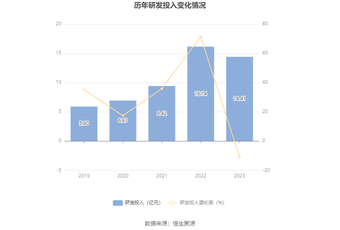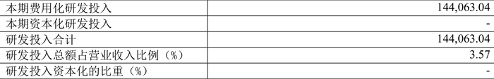 2023年全年,公司研发投入金额为14.41亿元,同比下降10.74%;研发投入占营业收入比例为3.57%,相比上年同期下降0.53个百分点。此外,公司全年研发投入资本化率为0。
