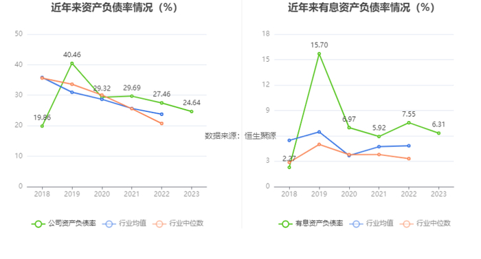 在偿债能力方面,公司2023年年末资产负债率为24.64%,相比上年末下降2.82个百分点;有息资产负债率为6.31%,相比上年末下降1.24个百分点。